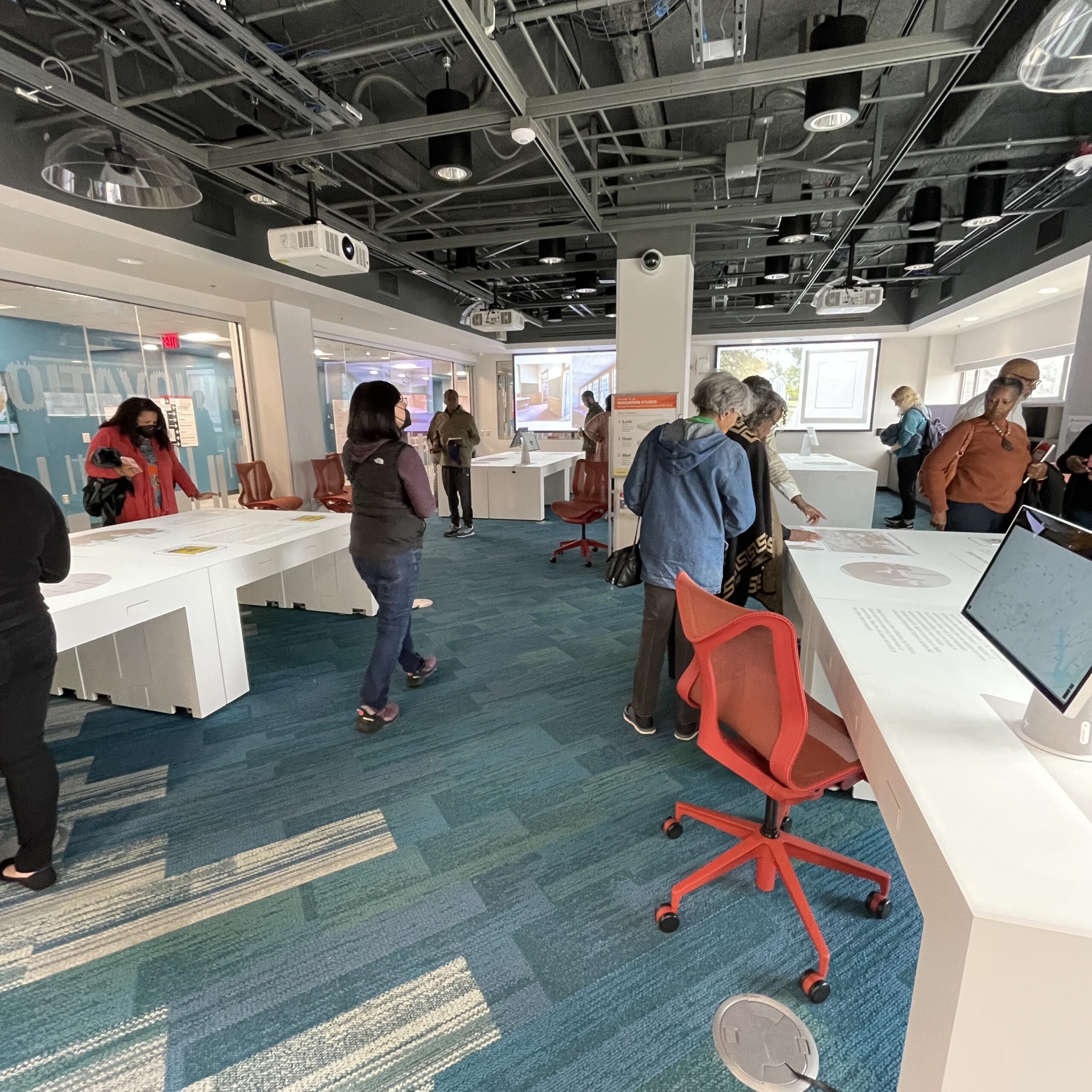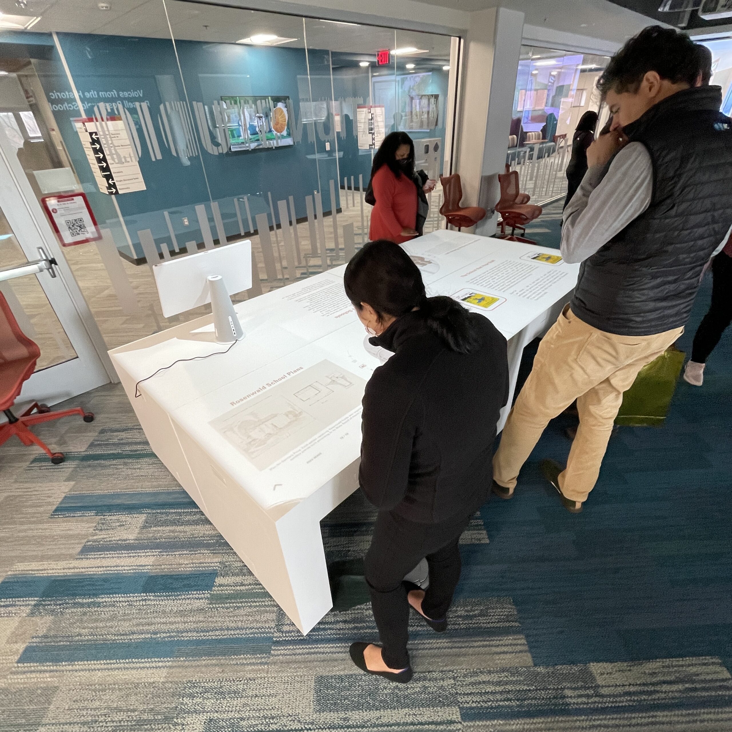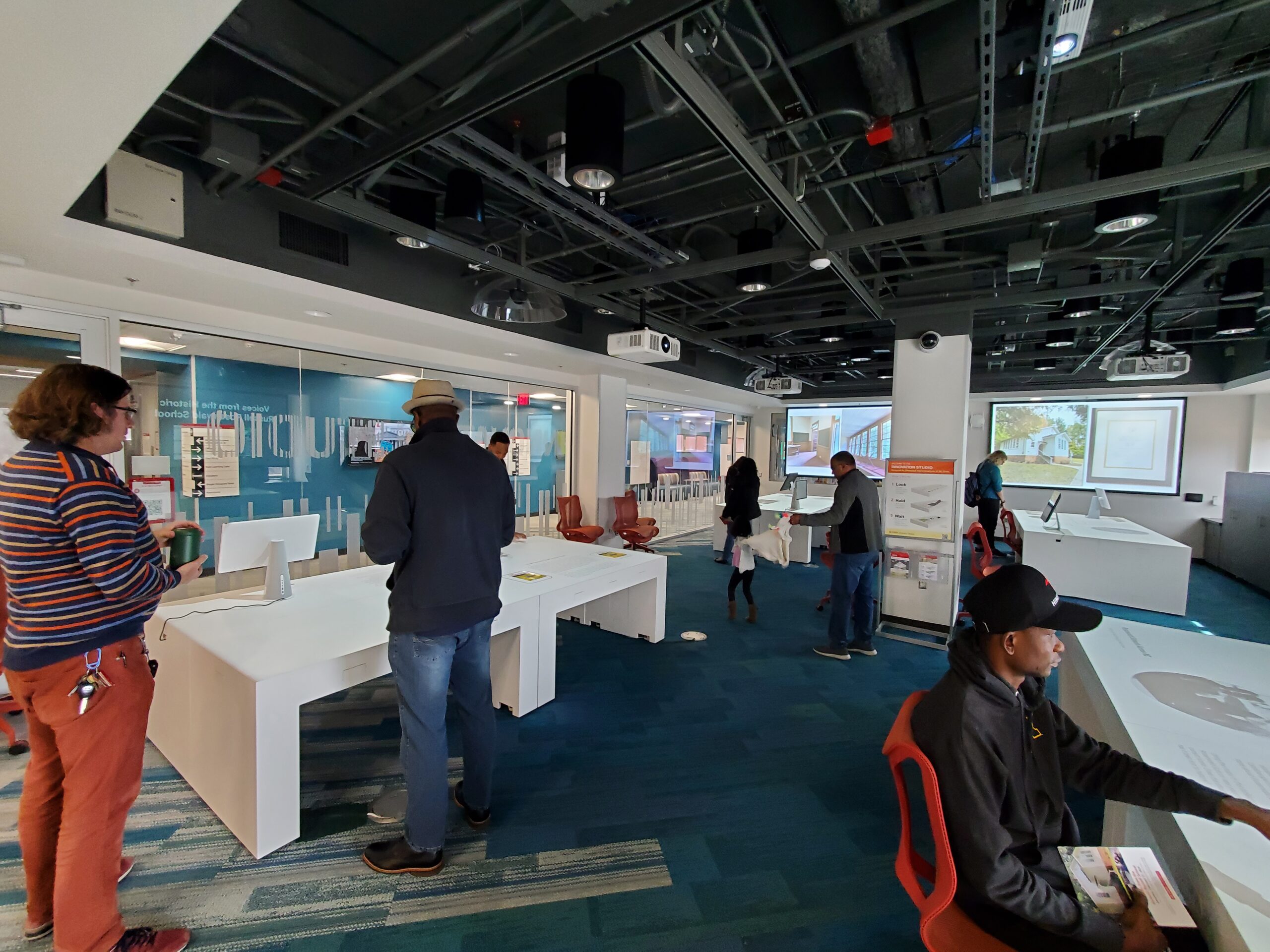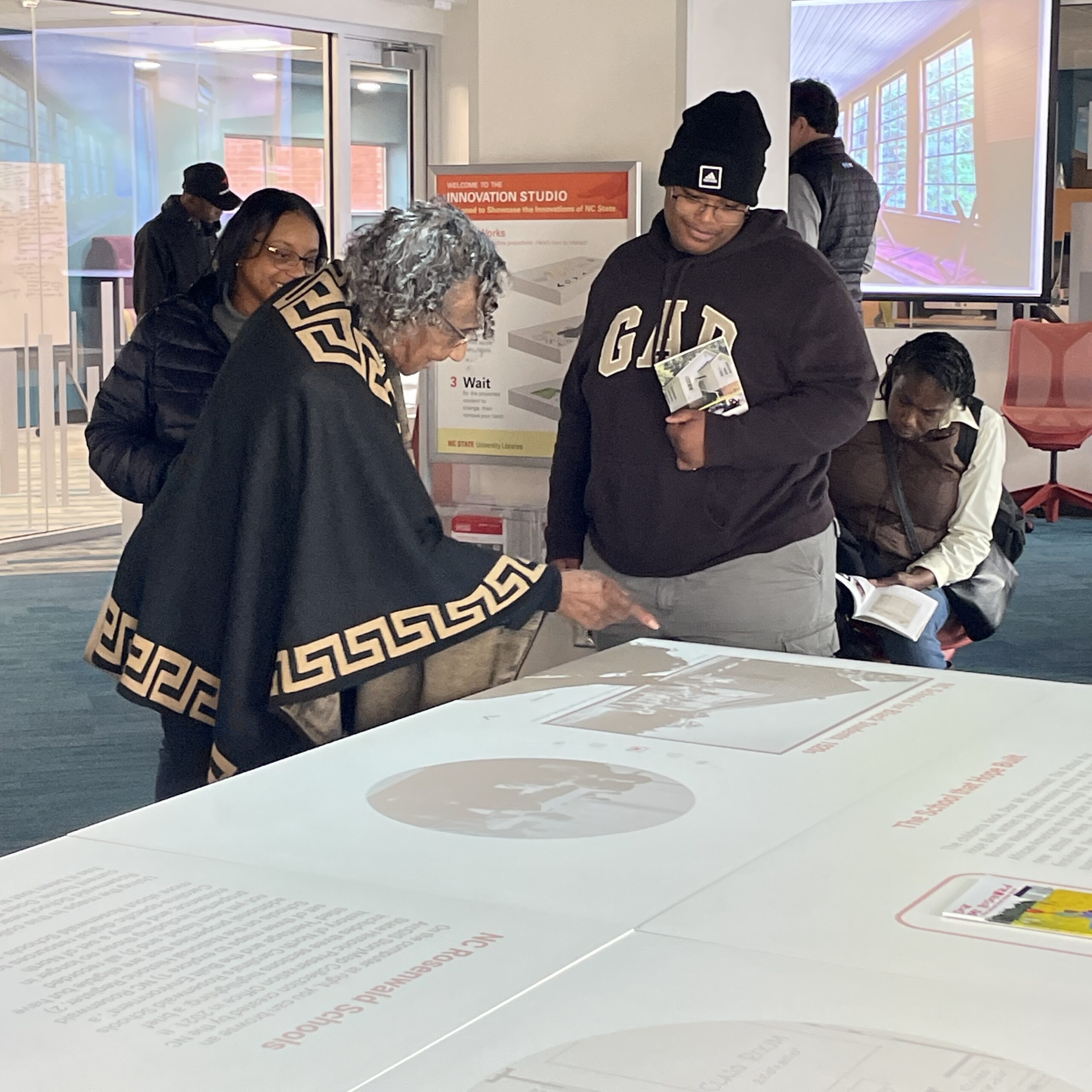 - Guests browse historical photographs and documents about the Rosenwald Schools program using the interactive, flat-top tables in the DH Hill Library’s Innovation Studio at NC State University