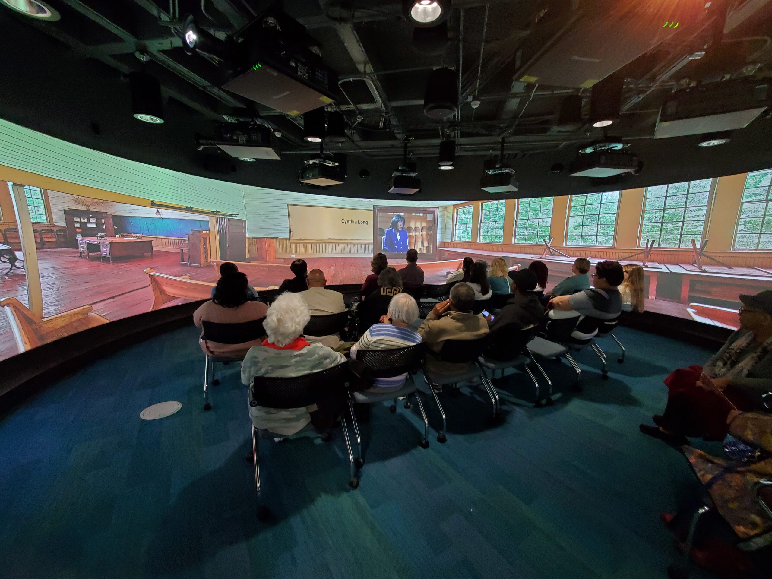 - Guests view an immersive 360-degree multimedia presentation featuring images from the Historic Russell School and interview footage from community members associated with the school in the visualization gallery in the DH Hill Library at NC State University