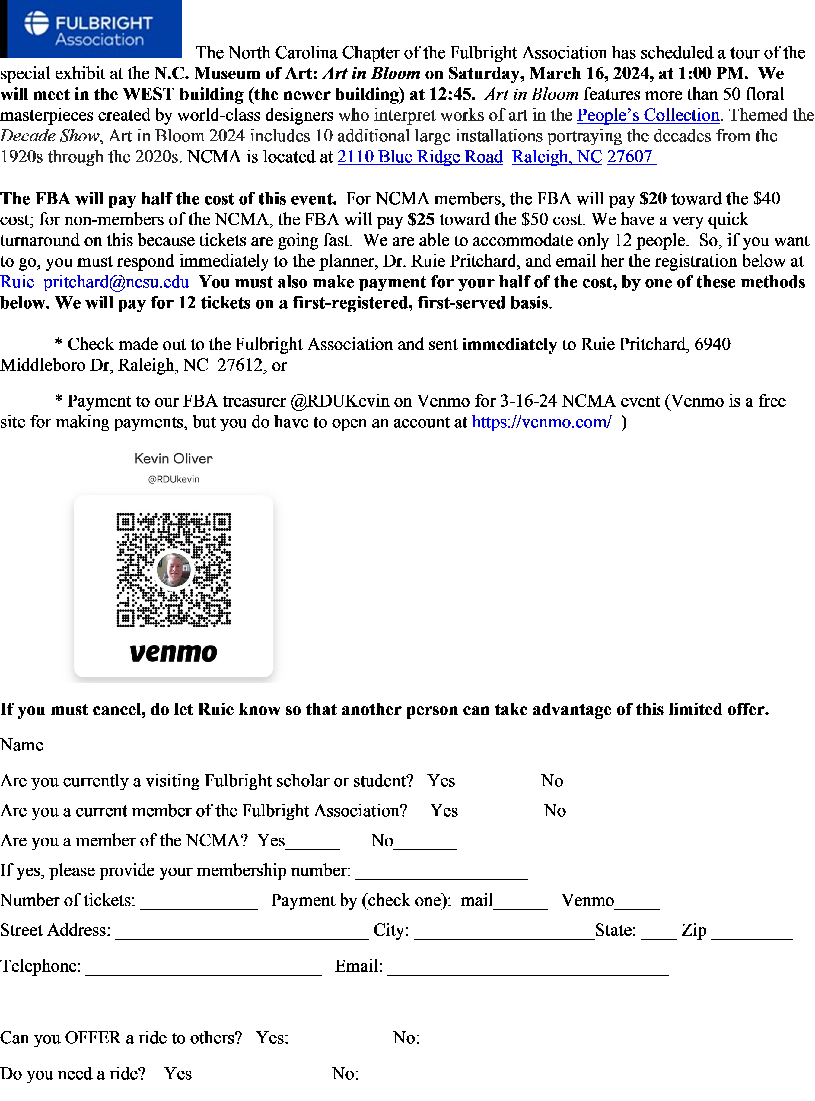 The North Carolina Chapter of the Fulbright Association has scheduled a tour of the special exhibit Art in Bloom at the NC Museum of Art on Saturday, March 16, 2024, at 1:00 PM. We will meet in the WEST building (the newer building) at 12:45.