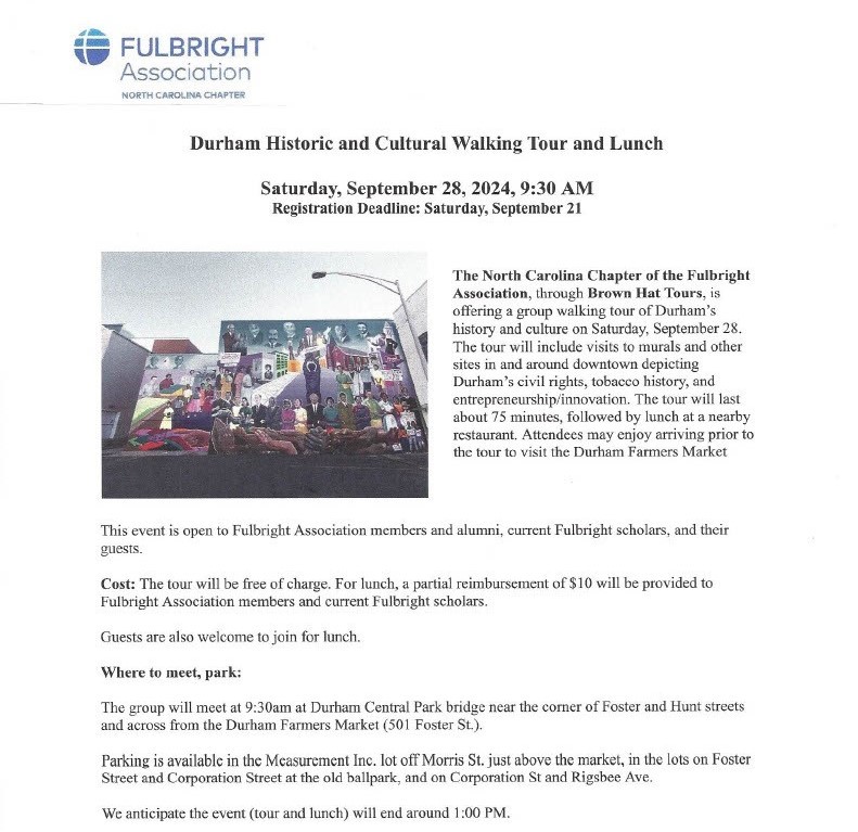 On September 28, 2024, we’re offering, through Brown Hat Tours, a FREE group walking tour of some of Durham’s historical and cultural sites. The tour will focus on civil rights, tobacco history, and entrepreneurship/innovation. Self-pay lunch with a partial reimbursement for members is an option after the tour. Reservations are required. See the flyer for details!