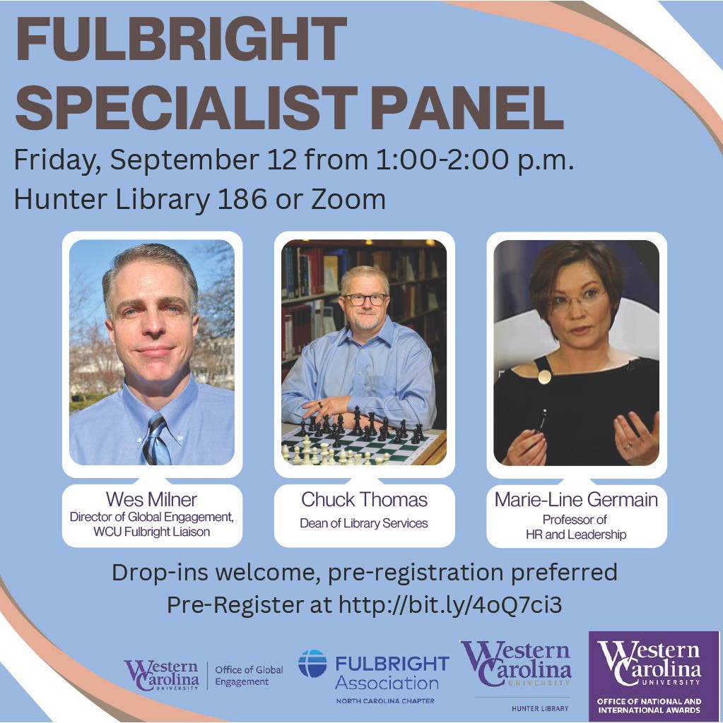 Our chapter is pleased to co-sponsor a Fulbright Specialist panel at Western Carolina University (WCU). See the flyer for complete details. Registration is available at https://bit.ly/4oQ7ci3.